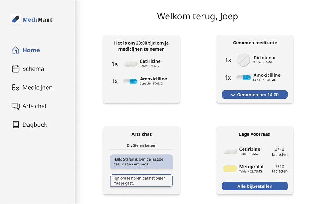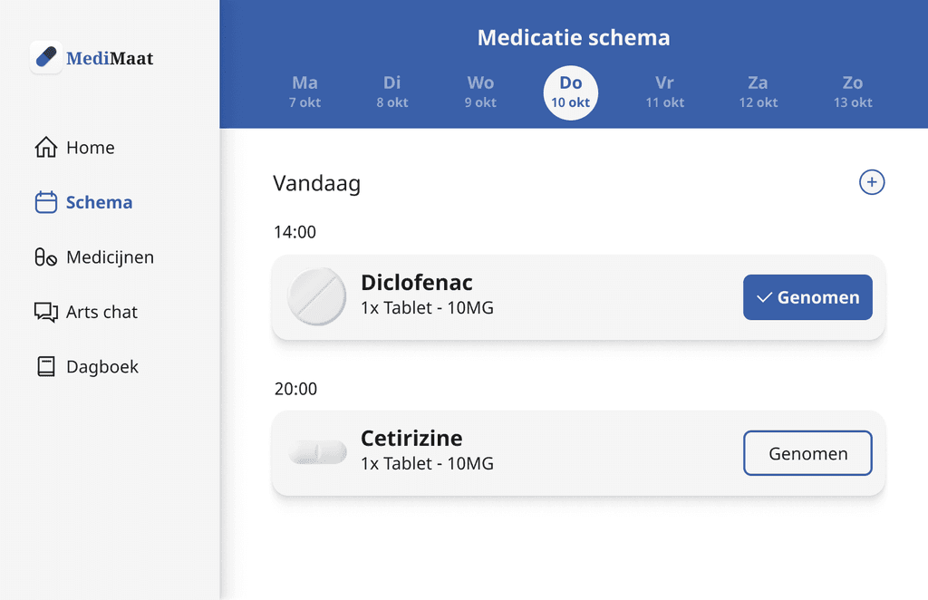 Medimaat is een multidevice app prototype dat je medicatie schema en inname bijhoud. De app is gemaakt voor mensen die regelmatig medicatie slikken als reminder om deze in te nemen.